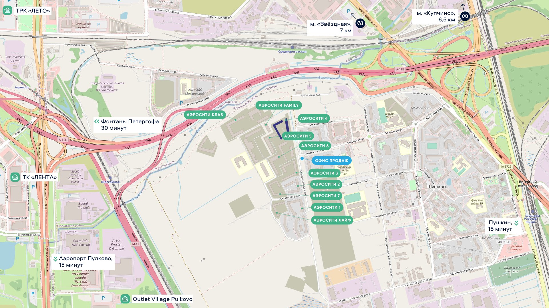 Квартал АЭРОСИТИ расположен на юге Санкт‐Петербурга, в самом зеленом и экологически чистом Пушкинском районе. Здесь гармонично сочетается комфорт мегаполиса, уют и спокойствие исторических пригородов.
