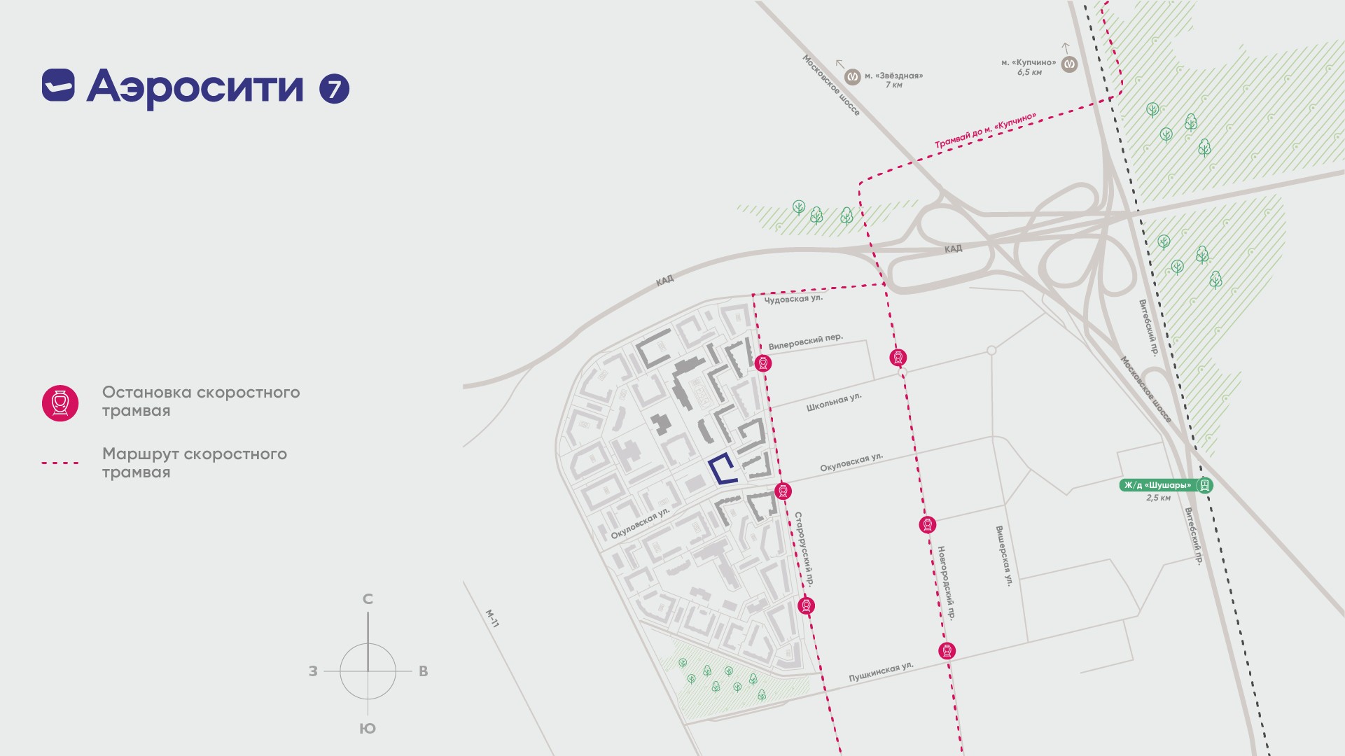 Аэросити 7 — новый проект комфорт‐класса от ГК «Лидер Групп» в составе развитого семейного квартала АЭРОСИТИ. Жилой комплекс располагается рядом с новым Старорусским проспектом и строящейся линией скоростного трамвая «Славянка». Территория ЖК примыкает к образовательному кластеру, в который входят два детских сада и две школы, одна из них с 25‐метровым бассейном и большим стадионом. Еще один детский сад возводится девелопером в нескольких минутах ходьбы от нового проекта.
