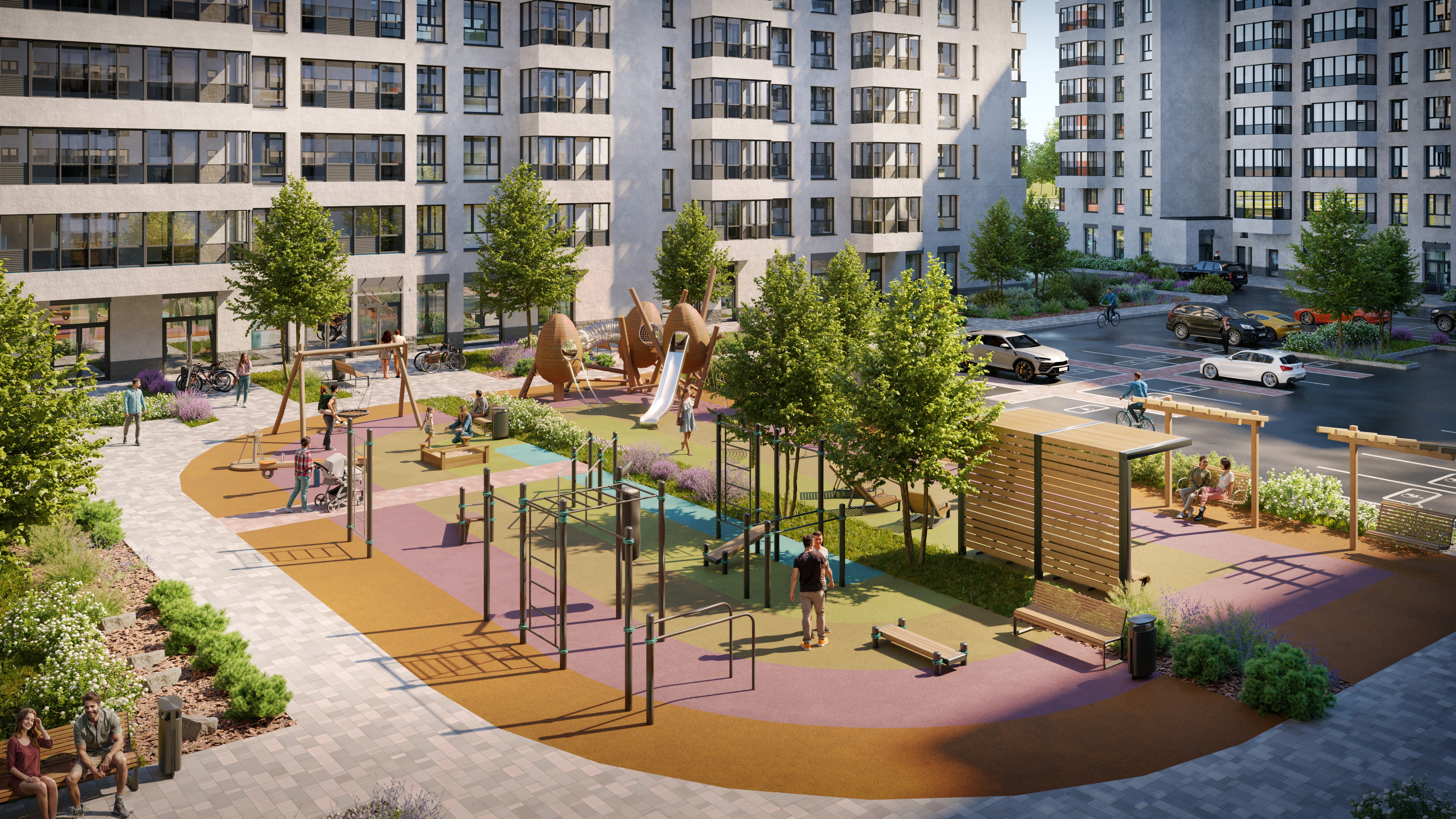 Геометрия здания образует закрытое внутридворовое пространство, свободное от машин, в котором расположится детский игровой городок, площадки для спокойного отдыха в тени деревьев, а для поклонников здорового образа жизни предусмотрен полноценный воркаут с различными группами тренажеров.