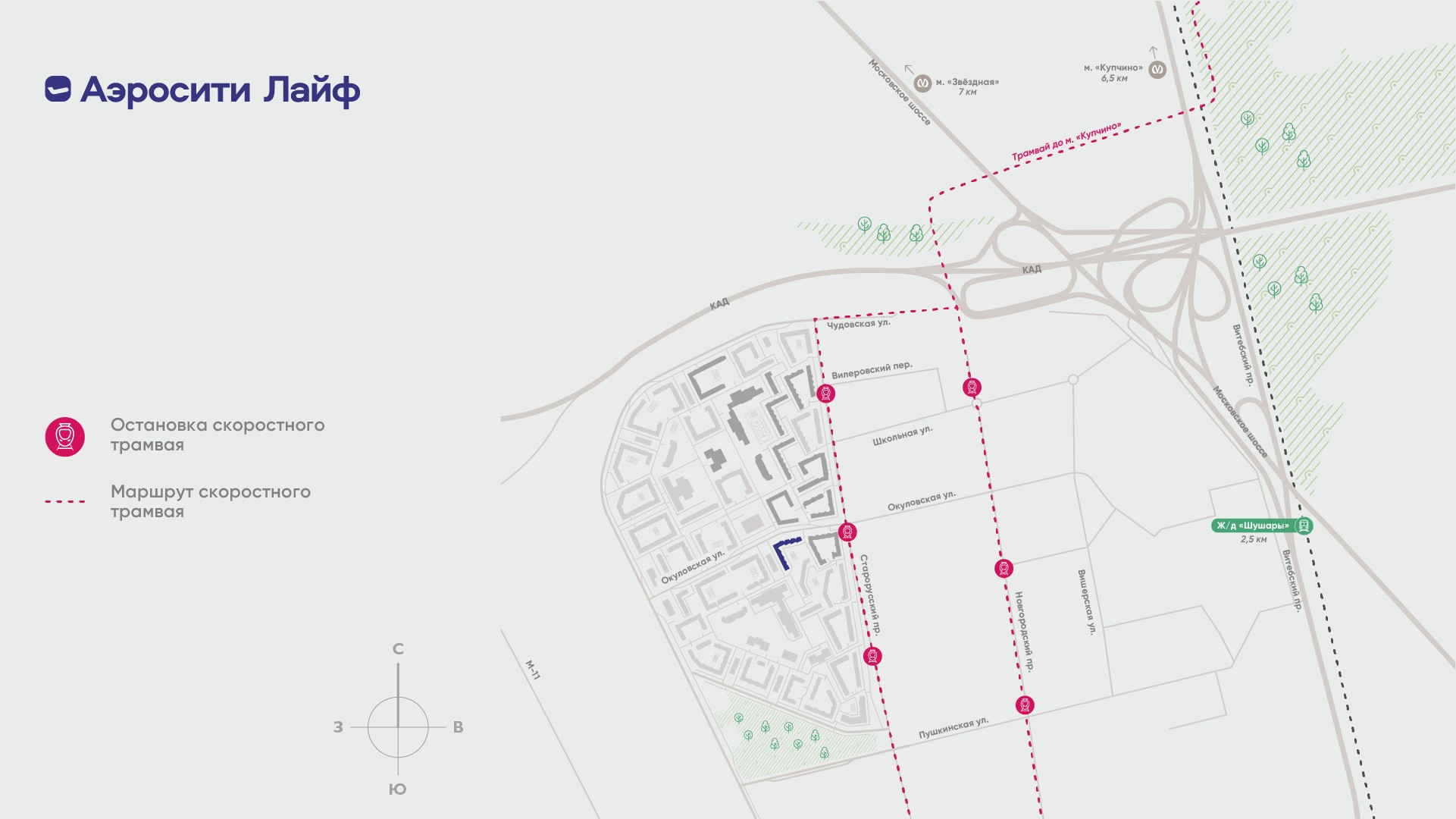 Еще одно важное преимущество проекта — близость к линии скоростного трамвая «Славянка», остановки которого расположены непосредственно у домов АЭРОСИТИ.