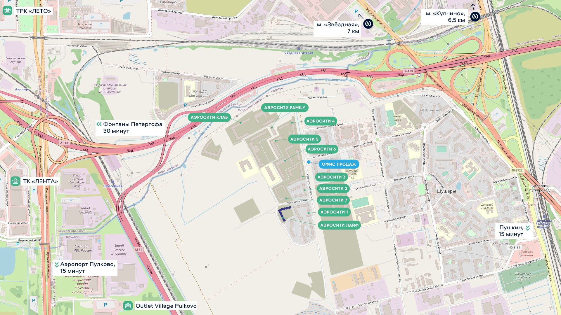 Расположенный на юге Санкт‐Петербурга, в живописном и экологически чистом Пушкинском районе, АЭРОСИТИ предлагает идеальное сочетание динамики мегаполиса и умиротворения исторических пригородов. Удобная транспортная доступность — еще одно из неоспоримых преимуществ проекта!
